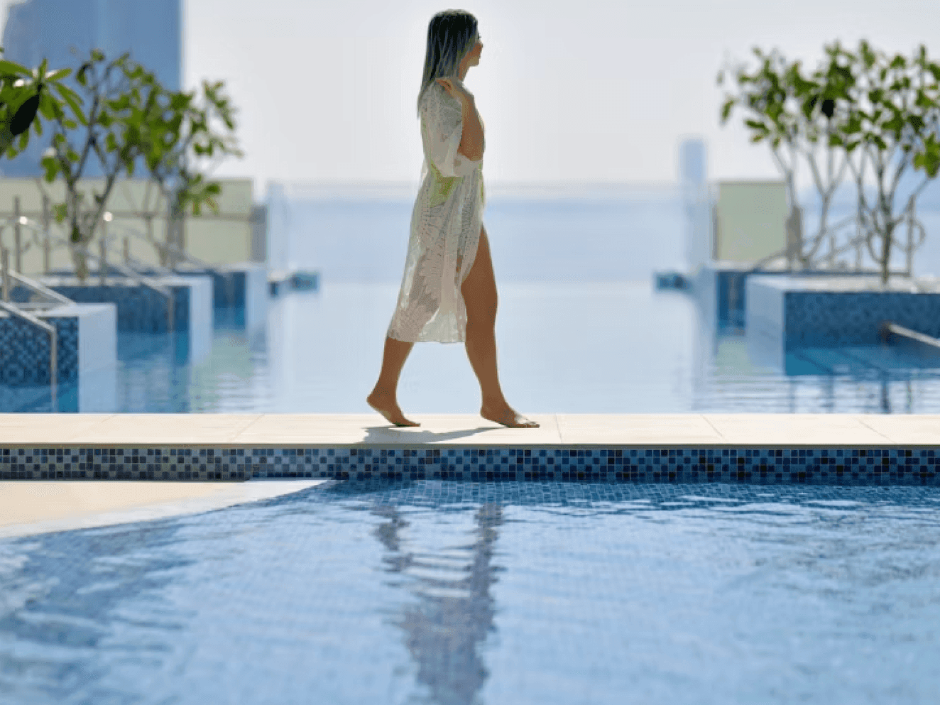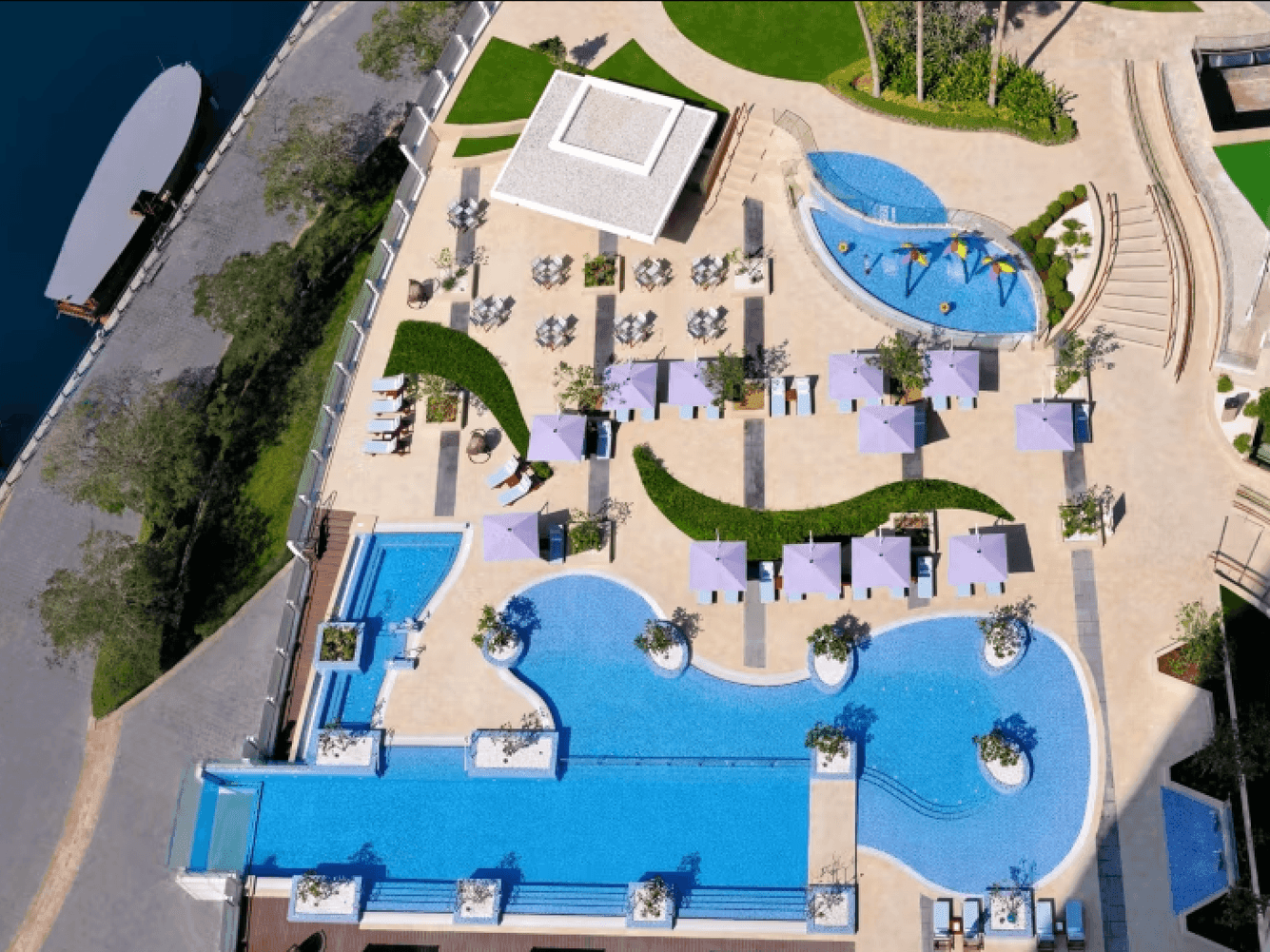 The InterContinental Dubai Festival City features a luxurious, multi-level swimming pool experience, complete with a sun-deck and stunning waterfront and skyline views of Dubai Creek. Guests can relax in the refreshing waters, which are described as a "renowned pool" and a key aspect of the hotel's commitment to offering a complete luxury experience with top-tier dining and leisure facilities. The pool area provides a serene environment for unwinding after exploring the adjoining Dubai Festival City Mall or the city.